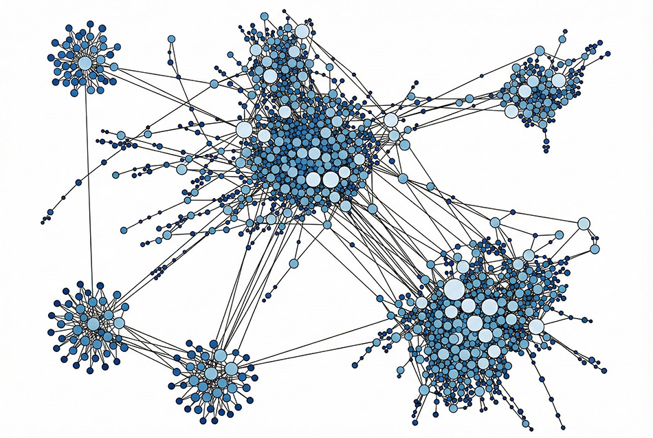 I ask you to think of this graphic of a network as a very approximate metaphor for interconnected domains of contemporary thinking. Consider the points (or nodes) of the network to be ideas and the lines as logical connections. Modified from an original by Martin Grandjean: https://commons.wikimedia.org/wiki/File:Network_Visualization.png
